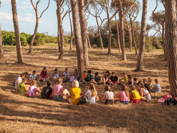 Un gruppo di persone sedute in cerchio tra alberi alti in una radura.