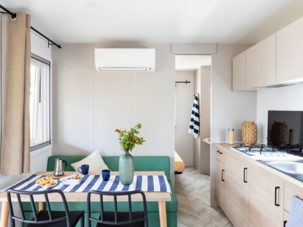 Alloggi in muratura con aria condizionata, angolo cottura attrezzato, bagno con doccia, patio o verande arredati con tavolo e sedie. A seconda delle tipologie, camera da letto matrimoniale e letti singoli in soggiorno. In alcuni presente il doppio bagno.