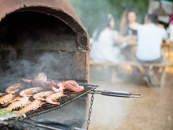 Cibo, tra cui gamberi e polpo, griglia su barbecue con persone sedute sullo sfondo.