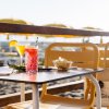 Tavoli e sedie gialle all'aperto, ombrelloni gialli sulla spiaggia in lontananza.
