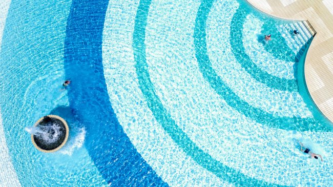 Vista dall'alto di una piscina con motivi ad arco e persone che nuotano.