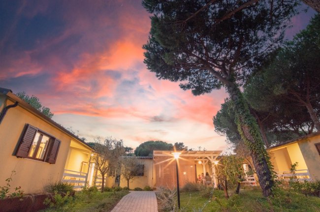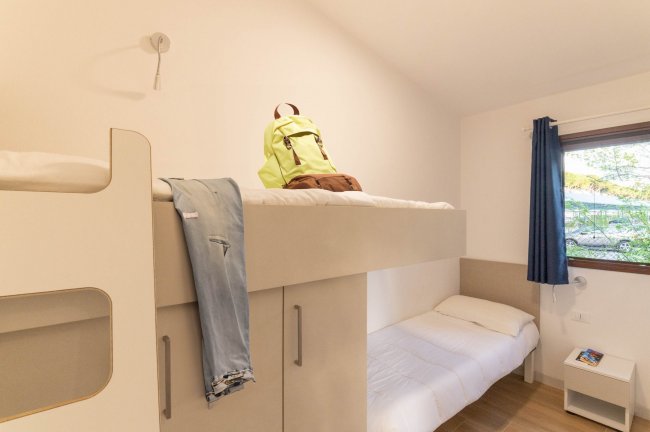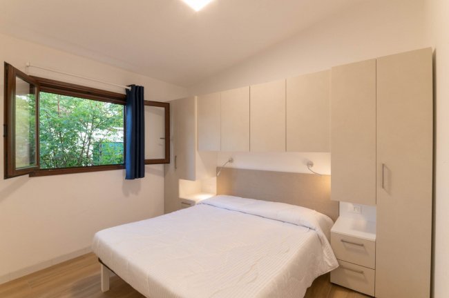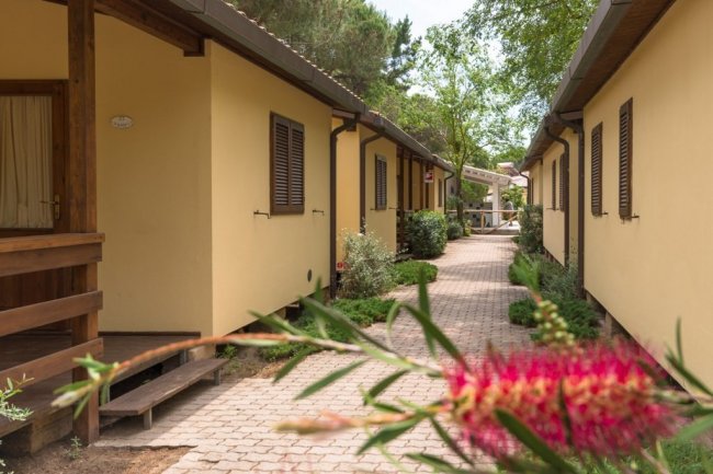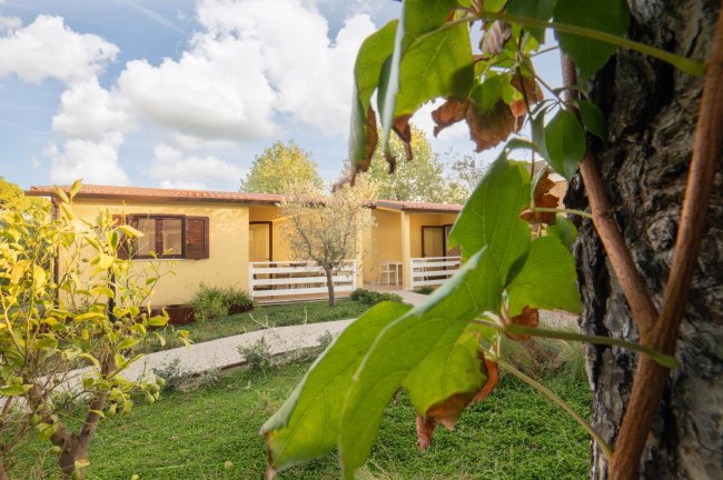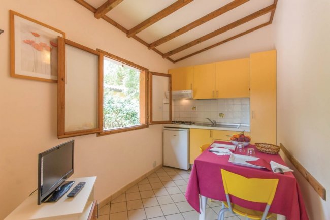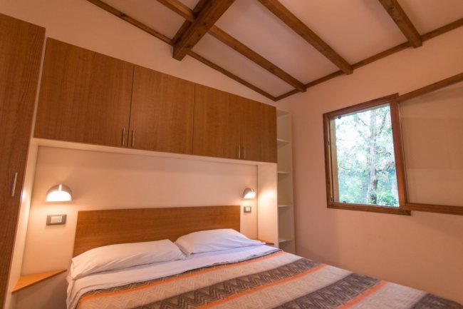 Casetta 4 posti: climatizzata, soggiorno con angolo cottura, camera matrimoniale, cameretta con due letti singoli, bagno con sanitari e box doccia, veranda e tv.