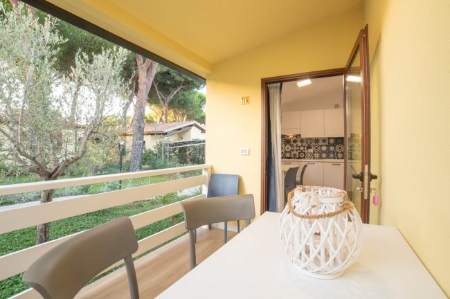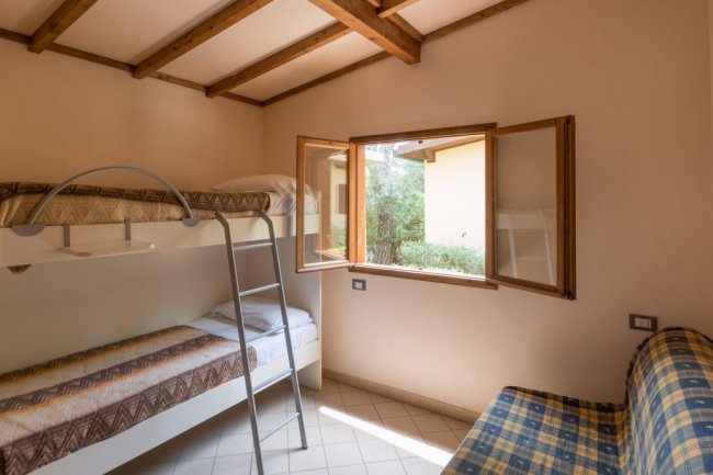 Bungalow trilocale fino 4+2 posti: climatizzato, in muratura, soggiorno con angolo cottura, camera matrimoniale, cameretta con letto a castello e divano letto o un 3° letto estraibile dal castello, bagno completo di sanitari e box doccia, veranda e tv.