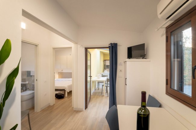 Casetta 2 posti: climatizzata, bilocale, soggiorno con angolo cottura, camera matrimoniale, bagno con sanitari e box doccia, veranda e tv.